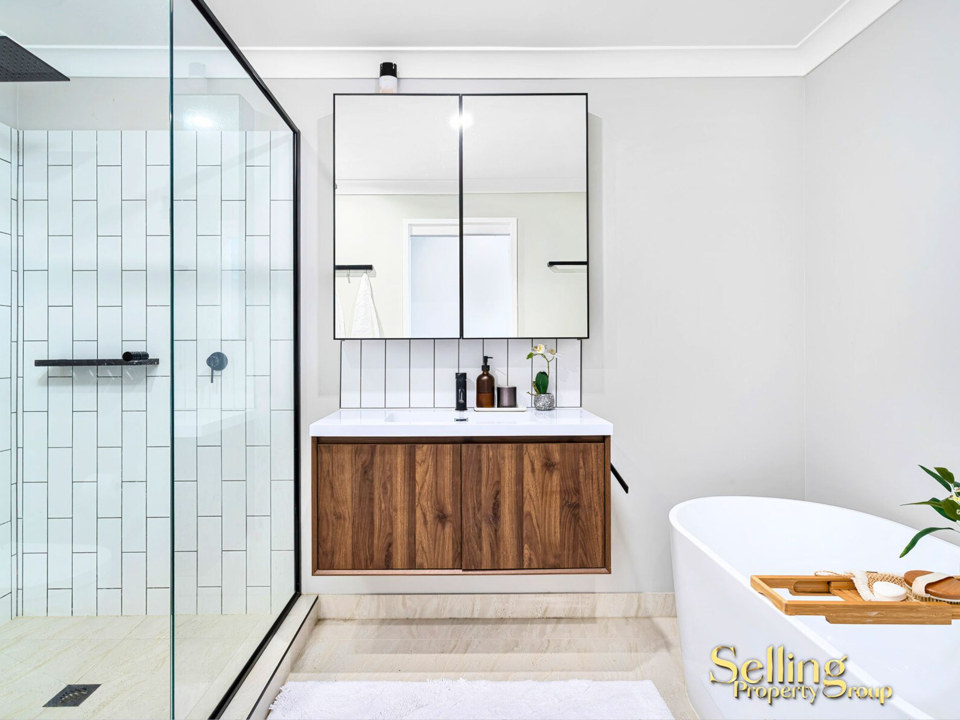 – Main bathroom boasting a freestanding bath & matte black fixtures.